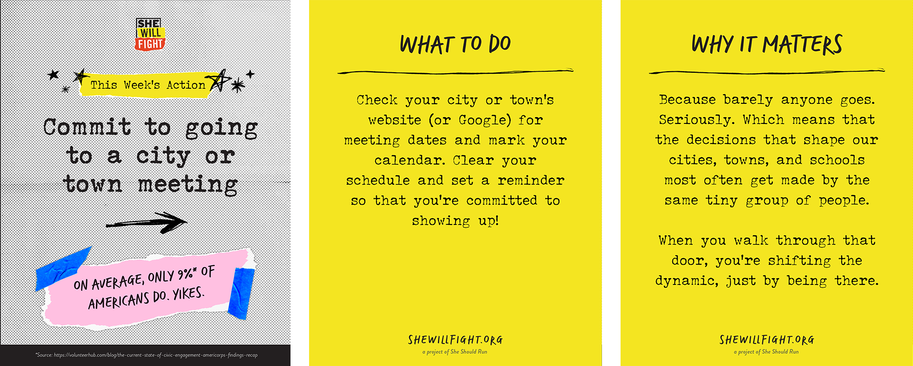 The She Should Run Resource Center is the only national virtual resource hub designed specifically for women at the pre-candidacy stage. In 2025, we released new civic resources that helped women take immediate action. Examples: